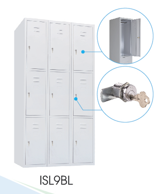 - Tủ locker dạng khối gồm 9 hộc chứa đồ, mỗi hộc có một bộ 2 chìa khoá riêng biệt.